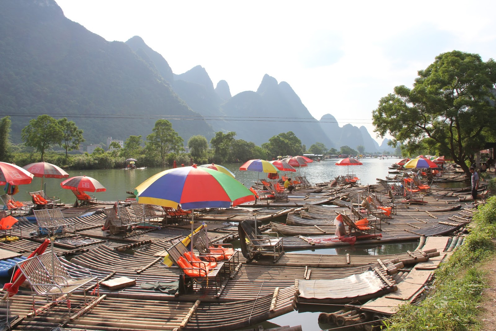 酒店大厅都有旅游櫃台,所提供的旅游配套,与外头的旅游公司一样,向住宿的酒店购买配套也比较放心,而且方便。四点半,这个时間要去那里呢?諮詢后,建議去遇龙河漂流,可以看到晚霞及山峦倒影。